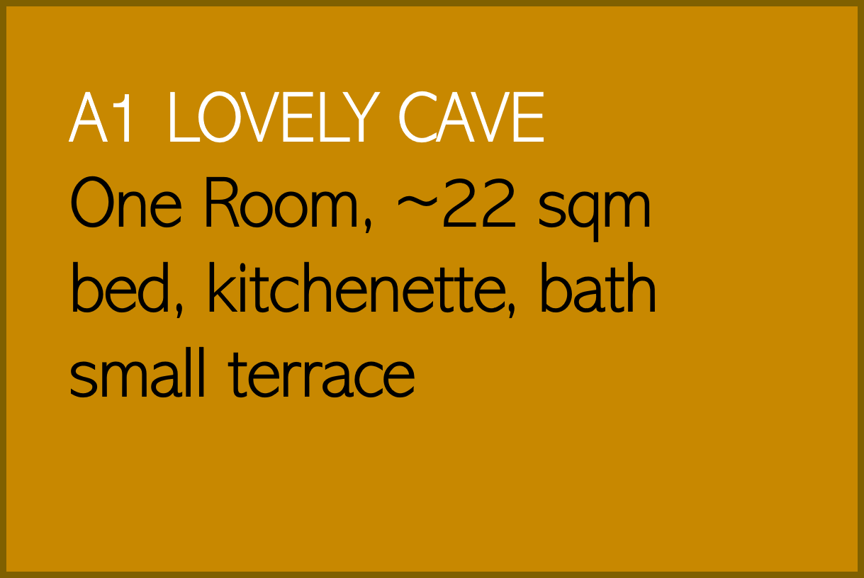 A1 LOVELY CAVE is a one room-apartment on the ground floor with a small (covered) terrace in house A. The room is structured by a round arch, which gives the cosy apartment an authentic atmosphere. Small, compact kitchenette, table, desk, bed (140/200) bed and storage space. Bathroom with shower and WC.